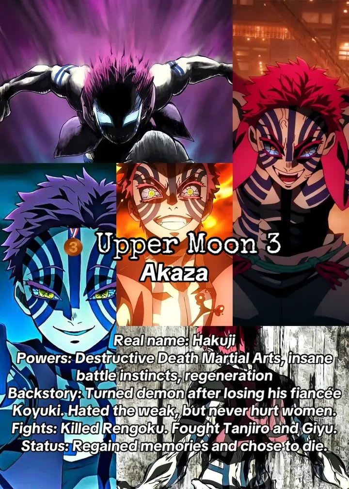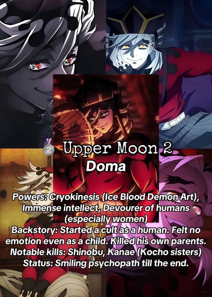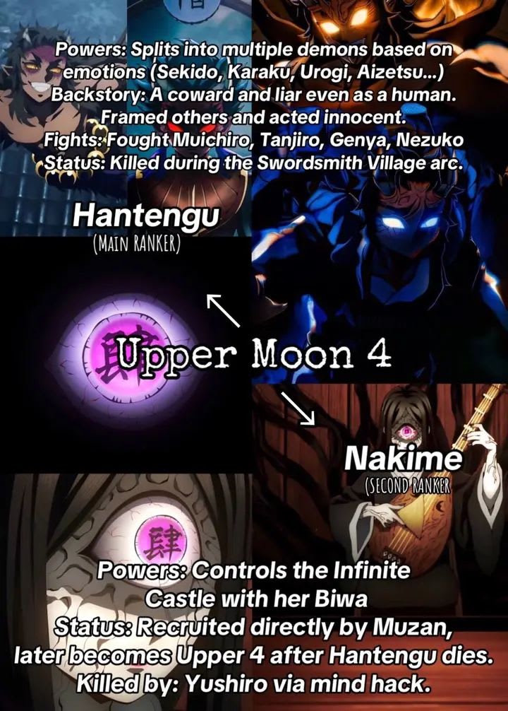 All deceased in the current anime except Uppermoon 1 "Kokushibo", Uppermoon 2 "Doma", and Uppermoon 4 "Nakime"
