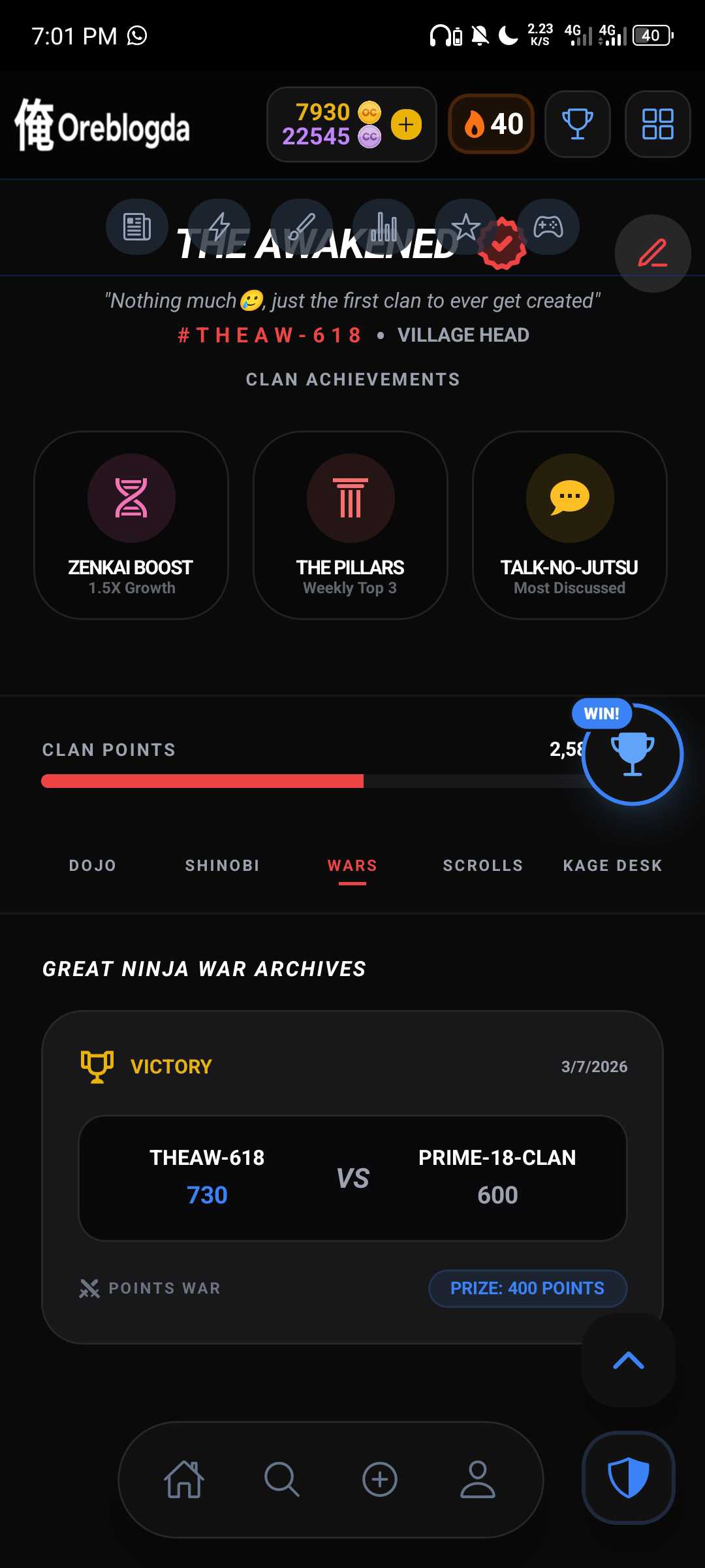 If you own a CLAN, CLAN WARS is a good chance to earn more CLAN points...